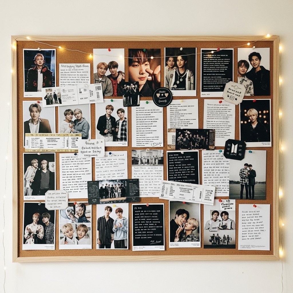 A BTS scrapbook wall is a creative way to display memories and favorite moments. You can create scrapbook pages with photos, concert tickets, and BTS quotes. Stick the pages on a wall or corkboard for an organized look. Add fairy lights and small decorations to make the wall look more aesthetic. This DIY idea is perfect for fans who love collecting BTS memories.