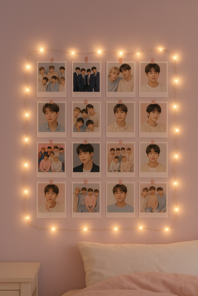 Creating a BTS photo wall collage is one of the easiest and most popular decor ideas. You can print your favorite BTS photos and arrange them in a grid or random pattern for a visually appealing look. Use washi tape or mini clothespins to attach the photos to the wall without damaging the paint. Add fairy lights around the collage to give it a soft and cozy glow. This DIY idea is perfect for a bedroom wall above your bed or study area.