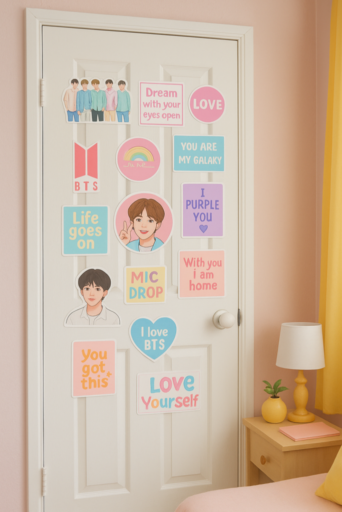 A BTS sticker wall is a quick and budget-friendly way to decorate your room. You can buy BTS stickers or print your own using sticker paper. Create a small sticker wall on your closet door or study area to make the room look more lively. Mix BTS stickers with aesthetic quotes and pastel patterns for a balanced look. This idea is great for fans who love easy DIY decor without spending too much time.