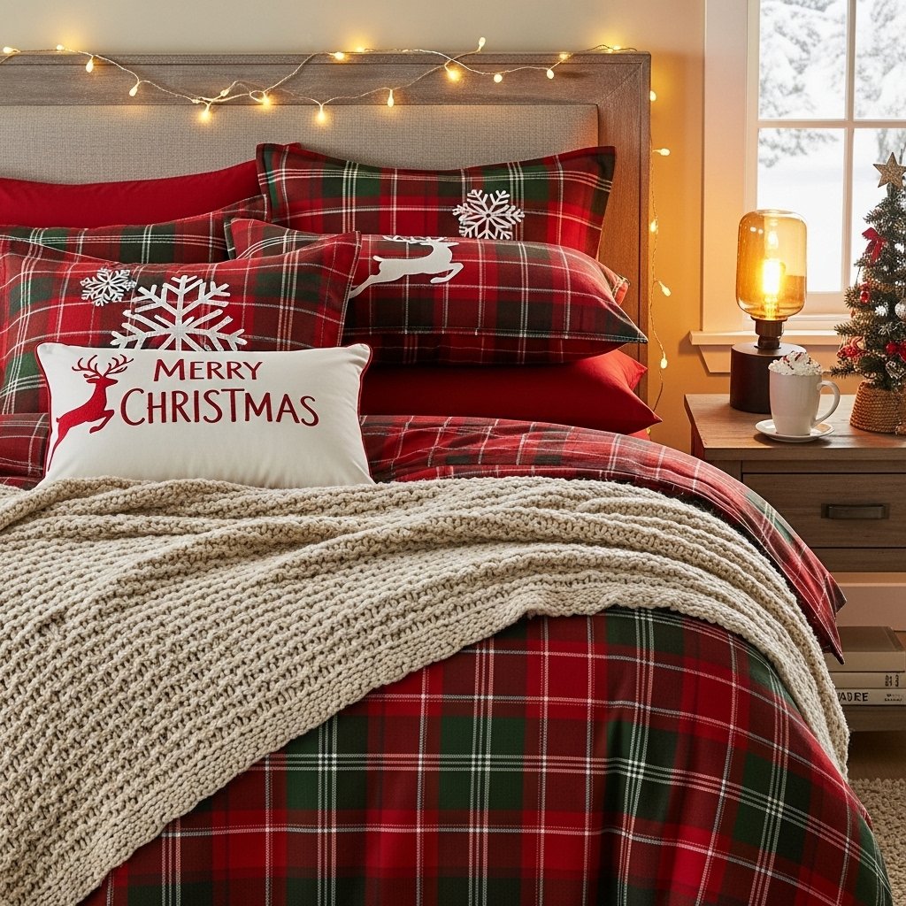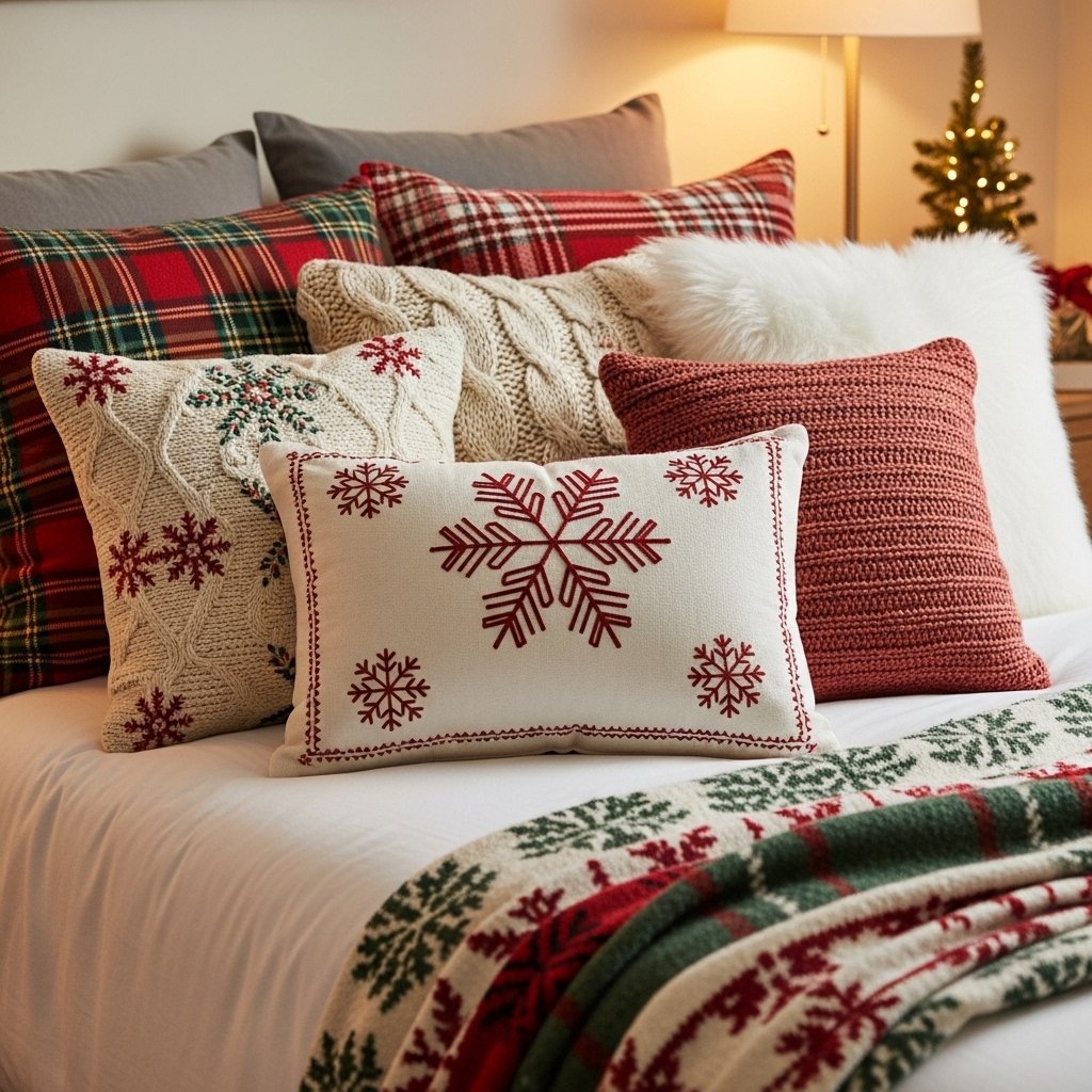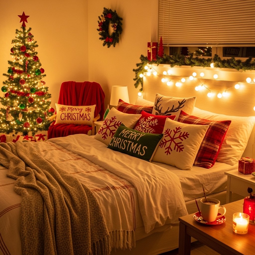 Throw pillows are one of the simplest ways to update your bedroom for Christmas. Swap your regular pillows with holiday-themed covers featuring patterns like snowflakes, Santa, or plaid designs. Mixing textures such as velvet, knit, or faux fur adds depth and coziness to your bed or seating area. These small accents make a big visual difference without requiring a full room makeover. Plus, they are easy to store and reuse every year.