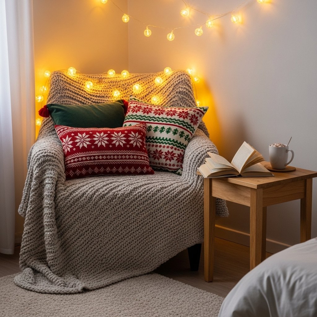 Create a small cozy corner in your bedroom dedicated to relaxation and holiday vibes. Add a soft blanket, a comfy chair, and a few festive pillows to design a warm reading nook. You can include a small lamp or fairy lights to enhance the cozy atmosphere. This space is perfect for reading, relaxing, or enjoying quiet holiday moments. It’s an easy idea that adds both function and style.