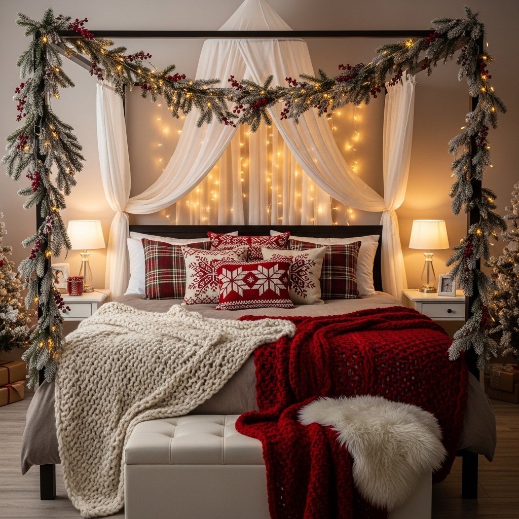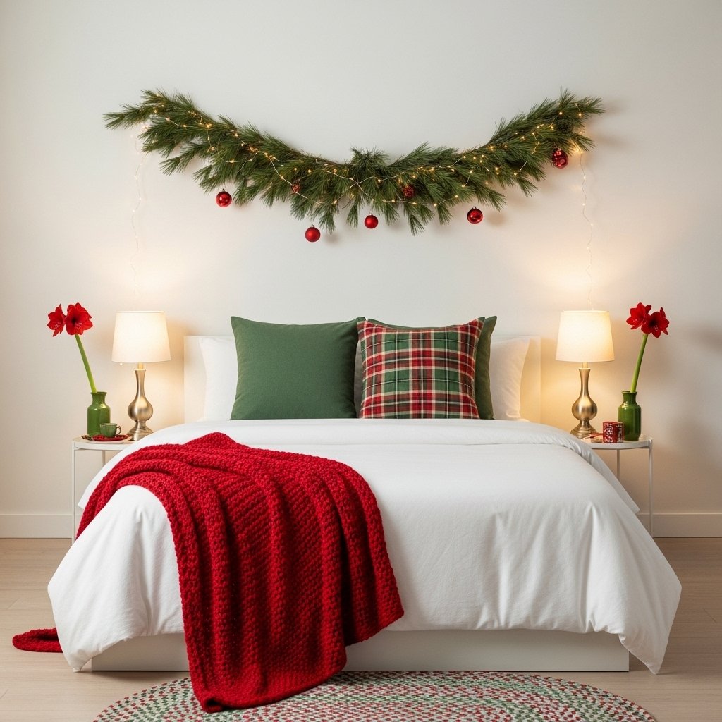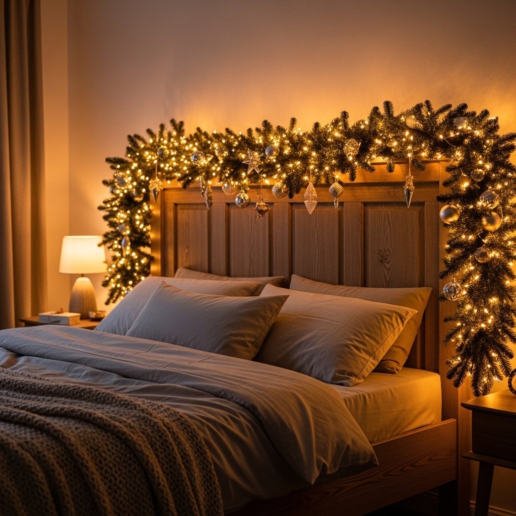 A simple garland can completely transform your bed into a holiday centerpiece. Drape a green garland across your headboard or along the wall behind your bed. You can use artificial greenery or DIY garlands made from paper, fabric, or tinsel. Adding small ornaments or fairy lights enhances the festive look even more. This decoration is easy to set up and creates a cozy Christmas vibe.