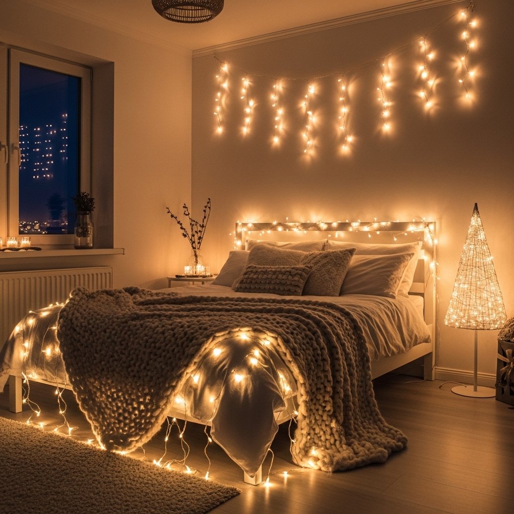 String lights are a must-have for creating a magical Christmas bedroom atmosphere. Warm white or soft yellow fairy lights can be draped around the bed frame, windows, or walls for a gentle glow. These lights instantly make the room feel cozy and relaxing, especially at night. You can also shape them into stars or hang them in curtain style for a dreamy aesthetic. This idea is affordable, easy to install, and perfect for small or large bedrooms.