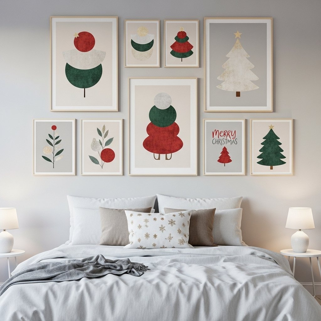 Decorating your bedroom walls with Christmas-themed art is an easy way to add seasonal charm. You can print festive quotes, winter landscapes, or holiday illustrations and frame them. Hanging lightweight art pieces or using removable wall tape keeps the process simple and damage-free. This idea allows you to customize your decor style, whether minimal or bold. It’s a budget-friendly way to make your room feel festive instantly.