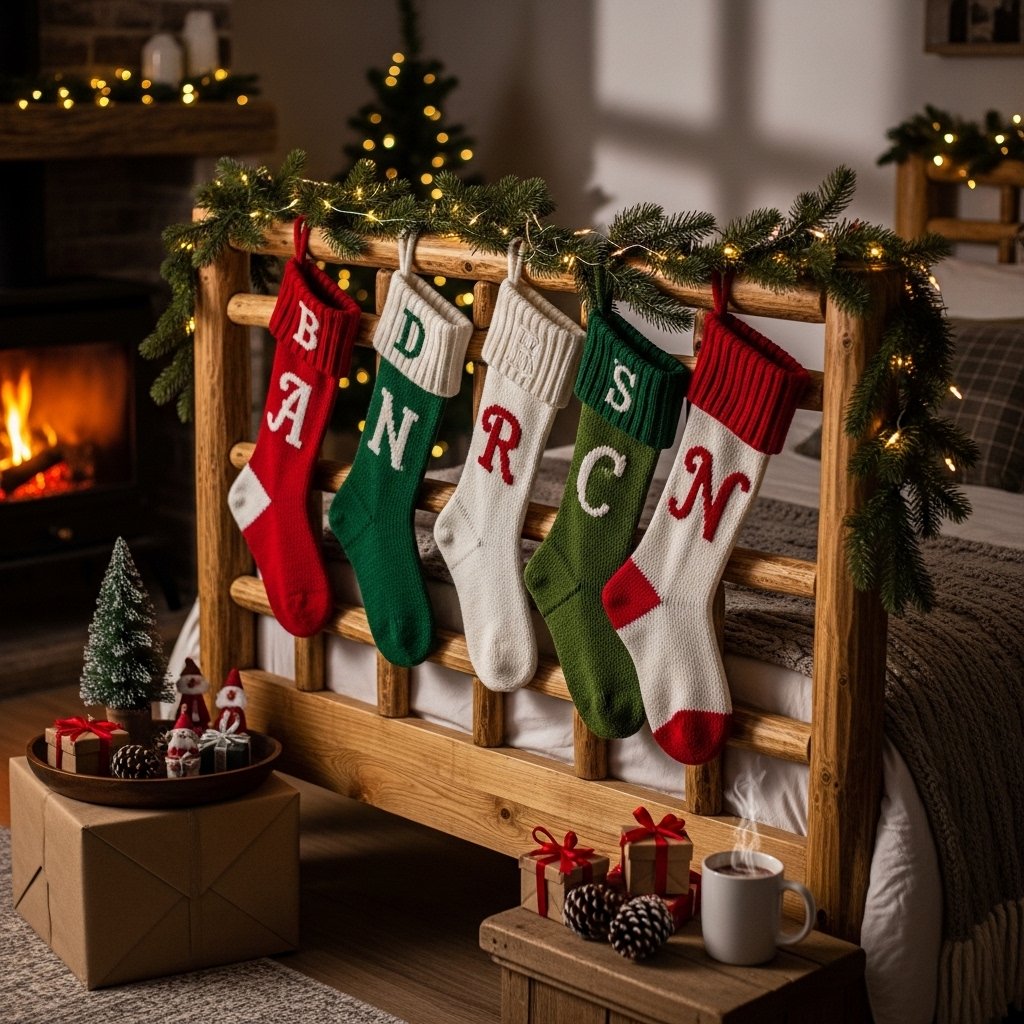 Hanging Christmas stockings in your bedroom adds a traditional holiday touch. You can hang them on the bed frame, wall hooks, or a small decorative ladder. Choose stockings that match your room’s color palette for a cohesive look. This idea is simple but brings strong festive charm to your space. It’s also a fun way to personalize your room during the holiday season.