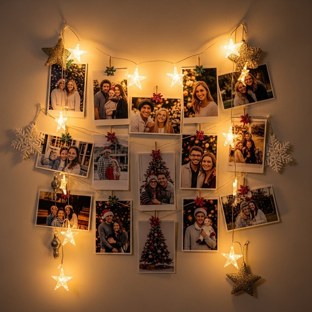 A Christmas photo wall is a great way to display your favorite memories and decorate your room. Use fairy lights or ribbon to hang printed photos of family, friends, and Christmas moments. Add small decorations like mini stars, bells, and snowflakes to enhance the look. This DIY idea is perfect for creating a warm and personal holiday atmosphere. Your photo wall will also make your room feel more lively and cheerful.