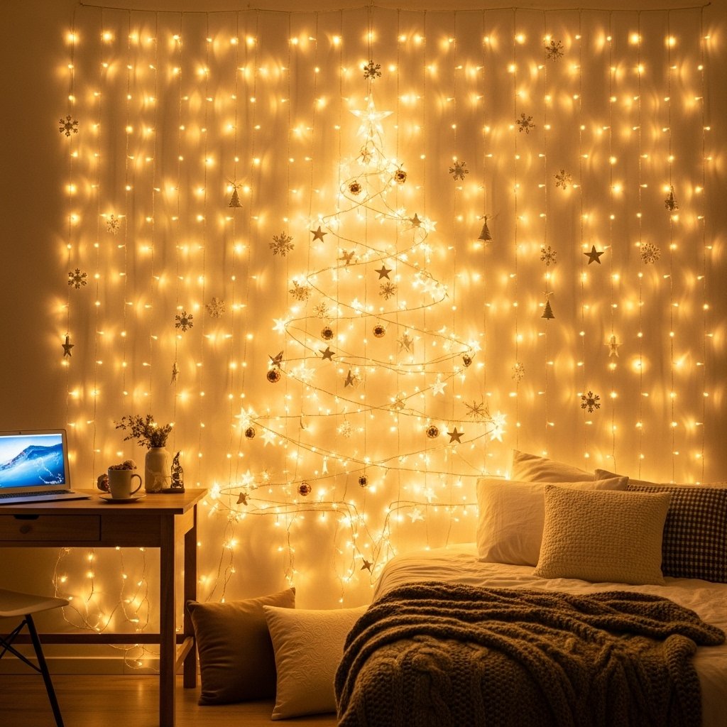 A fairy light wall instantly makes your room look magical and warm. You only need string lights and small hooks to create a glowing backdrop. Arrange the lights in a curtain style or shape them into a Christmas tree design for extra holiday vibes. This decor is perfect for bedrooms, living rooms, or even your study area. It also doubles as a beautiful background for Christmas photos.