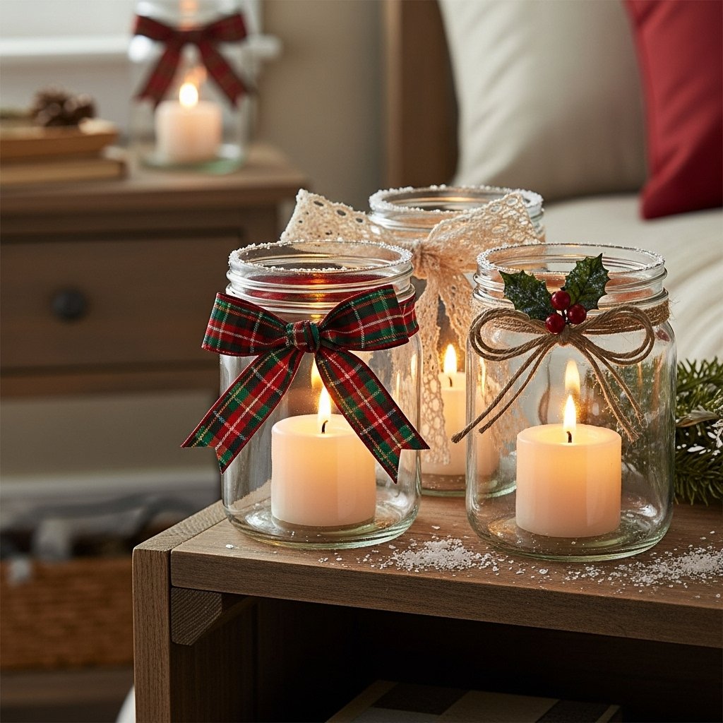 Christmas candle holders make your room look warm and elegant. Use glass jars and decorate them with ribbon, glitter, or fake snow. You can place small candles or fairy lights inside the jars for a cozy glow. Arrange them on your desk, shelf, or bedside table to create a peaceful holiday atmosphere. This DIY idea is perfect for creating a calm and festive mood.