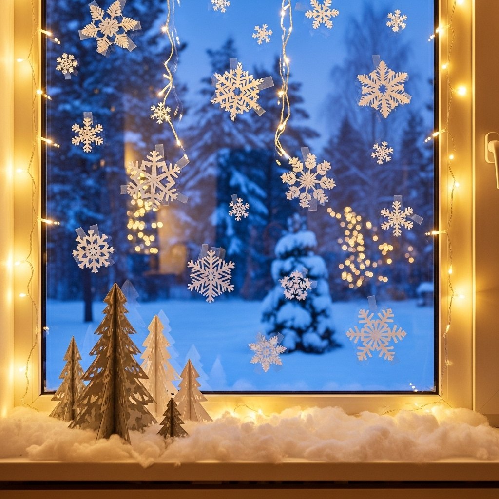Window decorations make your room look festive from inside and outside. You can create a DIY window decoration using cotton, paper, and stickers. Make a snowy scene with cotton snow and paper trees or snowflakes. Add small LED lights around the window frame for a glowing effect. This easy DIY decor makes your room look magical during Christmas nights.