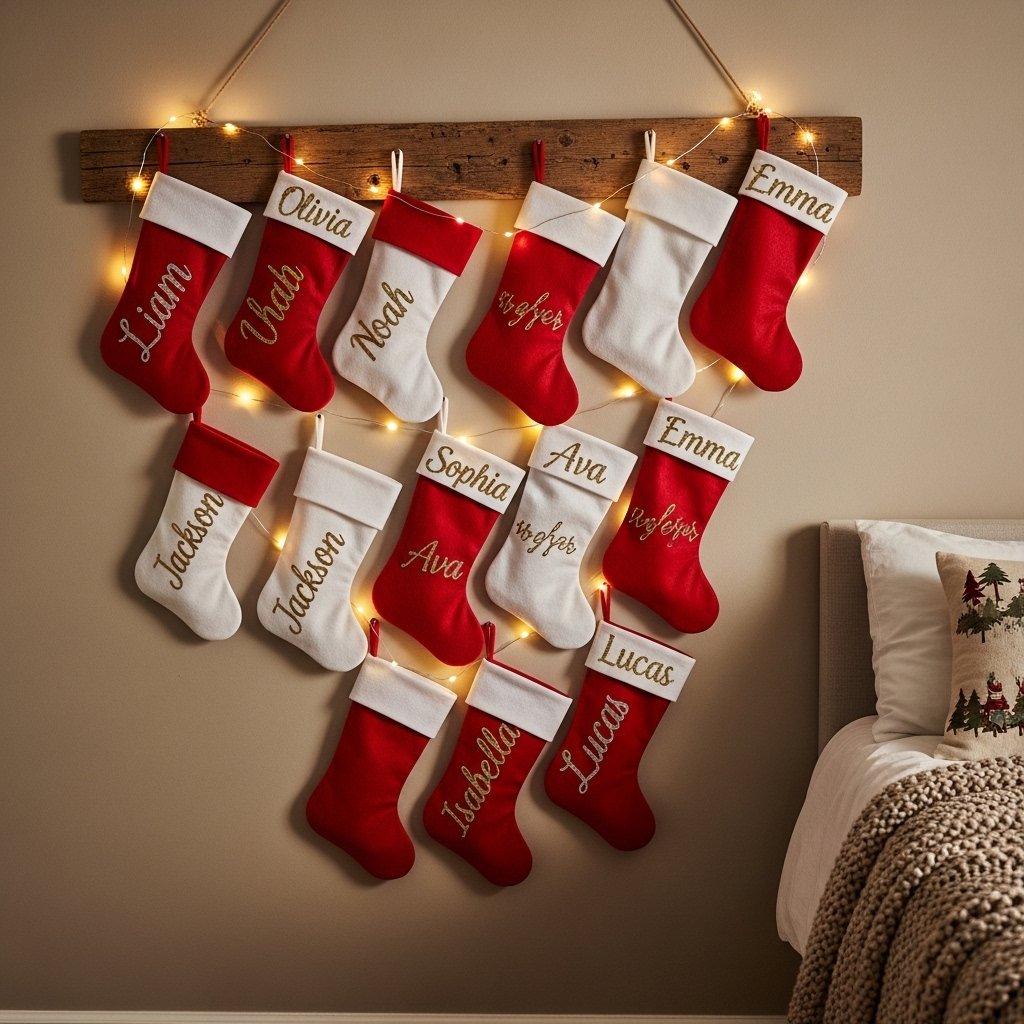Christmas stockings are a must-have for holiday decor and they look amazing on any wall. You can create DIY stockings using felt or fabric in red and white colors. Add names, glitter, and small ornaments to personalize them. Hang them on the wall or above your bed using hooks or ribbons. This DIY stocking display adds a cozy and festive look to your room.