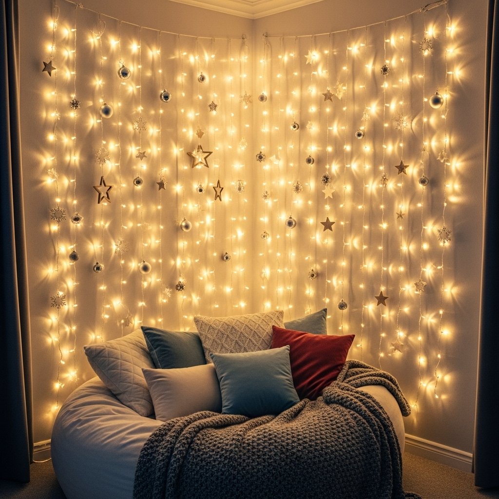 A fairy lights wall is a simple yet stunning way to add holiday sparkle to a teen room. Use warm white or multi-colored string lights and hang them in a curtain style across the wall. You can add small ornaments, photos, or paper snowflakes to make the wall look even more festive. This decor idea creates a cozy atmosphere for studying, hanging out, or relaxing during the holiday season. It’s easy to set up and can be reused every year.