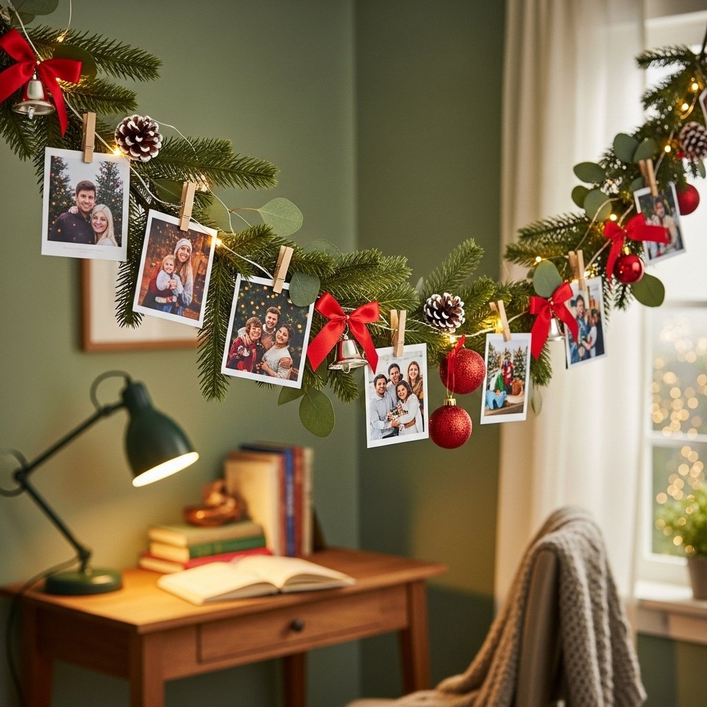A Christmas garland made with photos is a unique and personalized decoration for teens. Print small pictures of friends, family, and favorite memories, and attach them to a green garland using clothespins. Add mini ornaments, red ribbons, and tiny bells to enhance the festive look. This DIY decor not only looks stylish but also brings sentimental value to the room. It’s a perfect idea for teens who love memories and want a personalized holiday display.