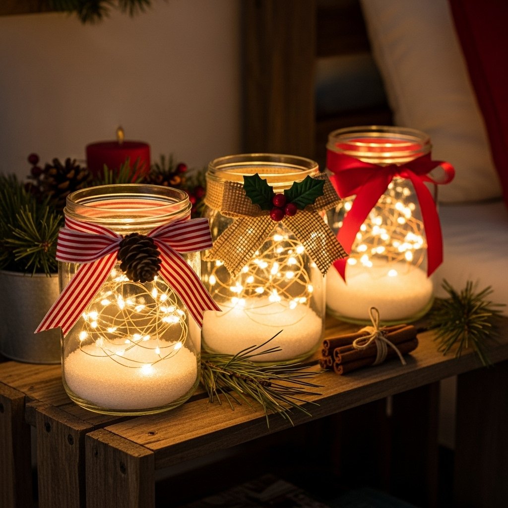 Candle jar lights create a warm and magical ambiance in a teen room. Use empty glass jars and fill them with fairy lights, glitter, and fake snow. You can decorate the jar with ribbon, pine cones, and mini ornaments. Place the jars on shelves or the bedside table for a cozy holiday glow. This DIY decor idea is safe and perfect for teens who want a soft, festive atmosphere.