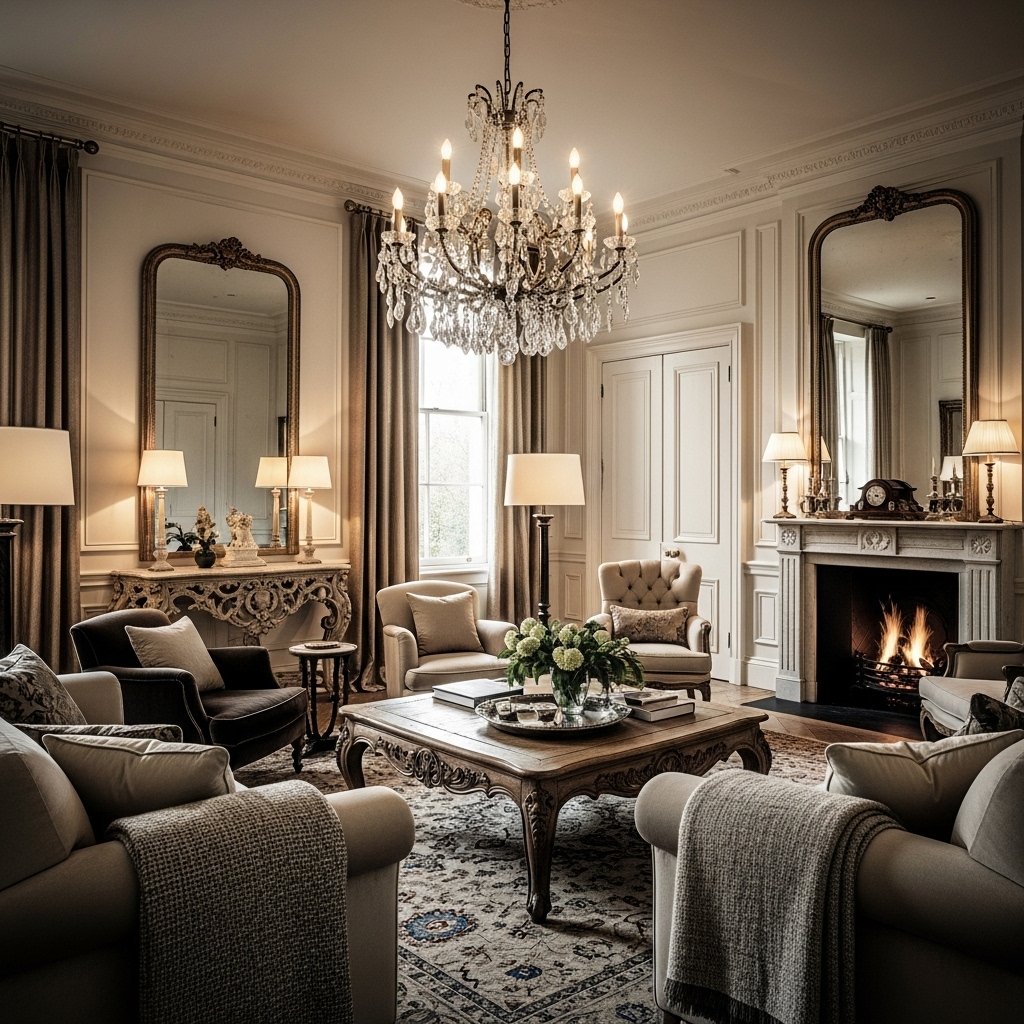 In addition to chandeliers, layered lighting is essential in a classic house interior. Table lamps, wall sconces, and floor lamps create a warm and inviting glow. Soft lighting enhances the textures and colors within the space. It also allows for different moods depending on the time of day. A well-lit room feels both comfortable and luxurious.