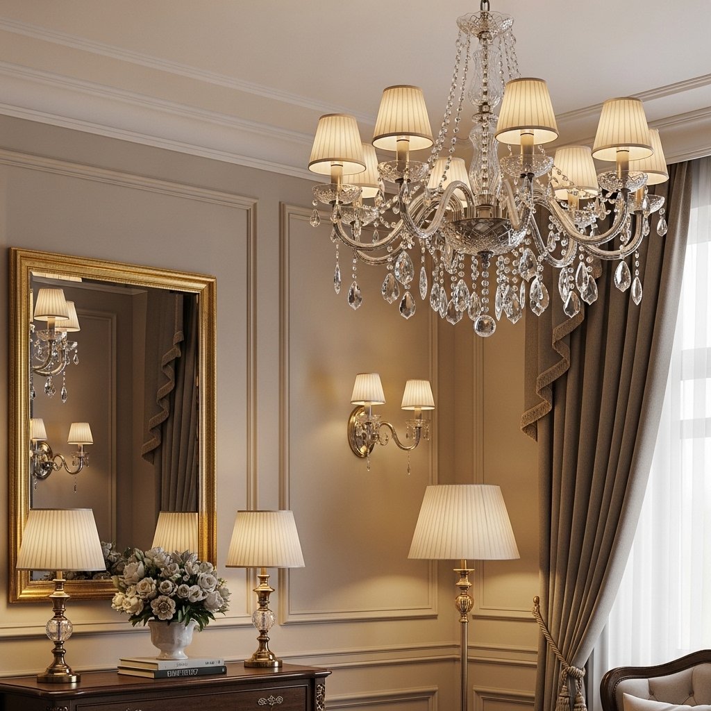 Lighting is a defining feature of classic interiors, with chandeliers often serving as the focal point of a room. Crystal chandeliers or vintage-style fixtures add glamour and sophistication. Soft, warm lighting is preferred to create a cozy yet luxurious atmosphere. Wall sconces and table lamps with fabric shades further enhance the layered lighting effect. Proper lighting design ensures that every corner of the room feels inviting and elegant.
