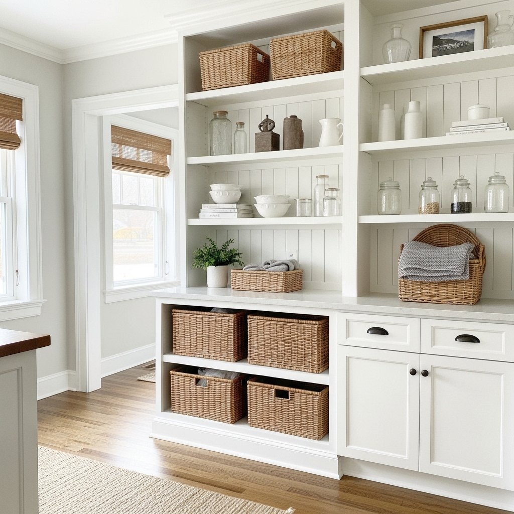 Storage is an important aspect of maintaining a clean and organized farmhouse interior. Use built-in shelves, baskets, and cabinets to keep clutter out of sight. Choose storage solutions that blend seamlessly with the overall design. Open shelving can display decorative items while still serving a practical purpose. Functional storage enhances both the aesthetic and usability of the space.