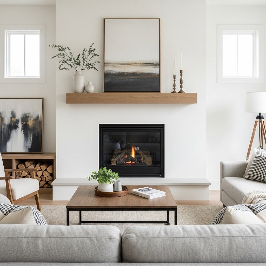 A fireplace often serves as the focal point in a contemporary farmhouse living room. Opt for a simple yet elegant design with a wooden or stone mantel. Keep the surrounding decor minimal to let the fireplace stand out. This feature adds warmth and creates a cozy gathering spot for family and guests. A well-designed fireplace enhances both comfort and style.