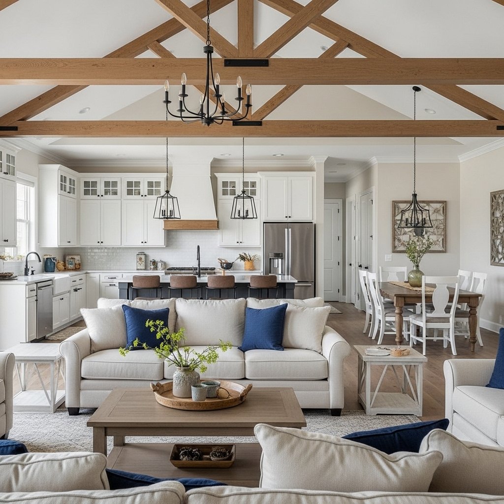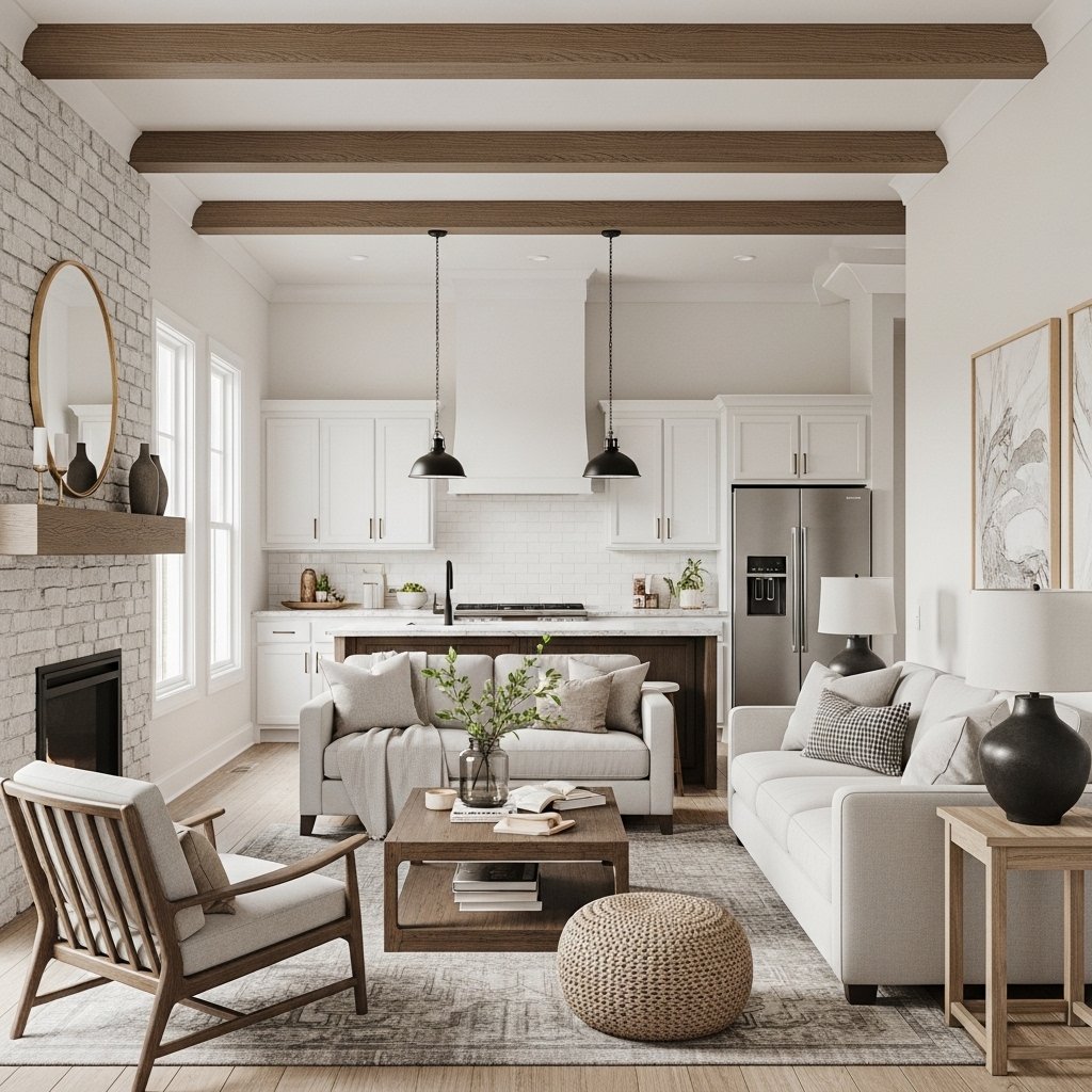 A contemporary farmhouse interior is a modern style that combines the warmth of traditional farmhouse design with clean and simple modern elements. It uses neutral colors, natural materials like wood, and minimal decoration to create a cozy yet stylish look. This style feels both comfortable and fresh, making it very popular in modern homes.