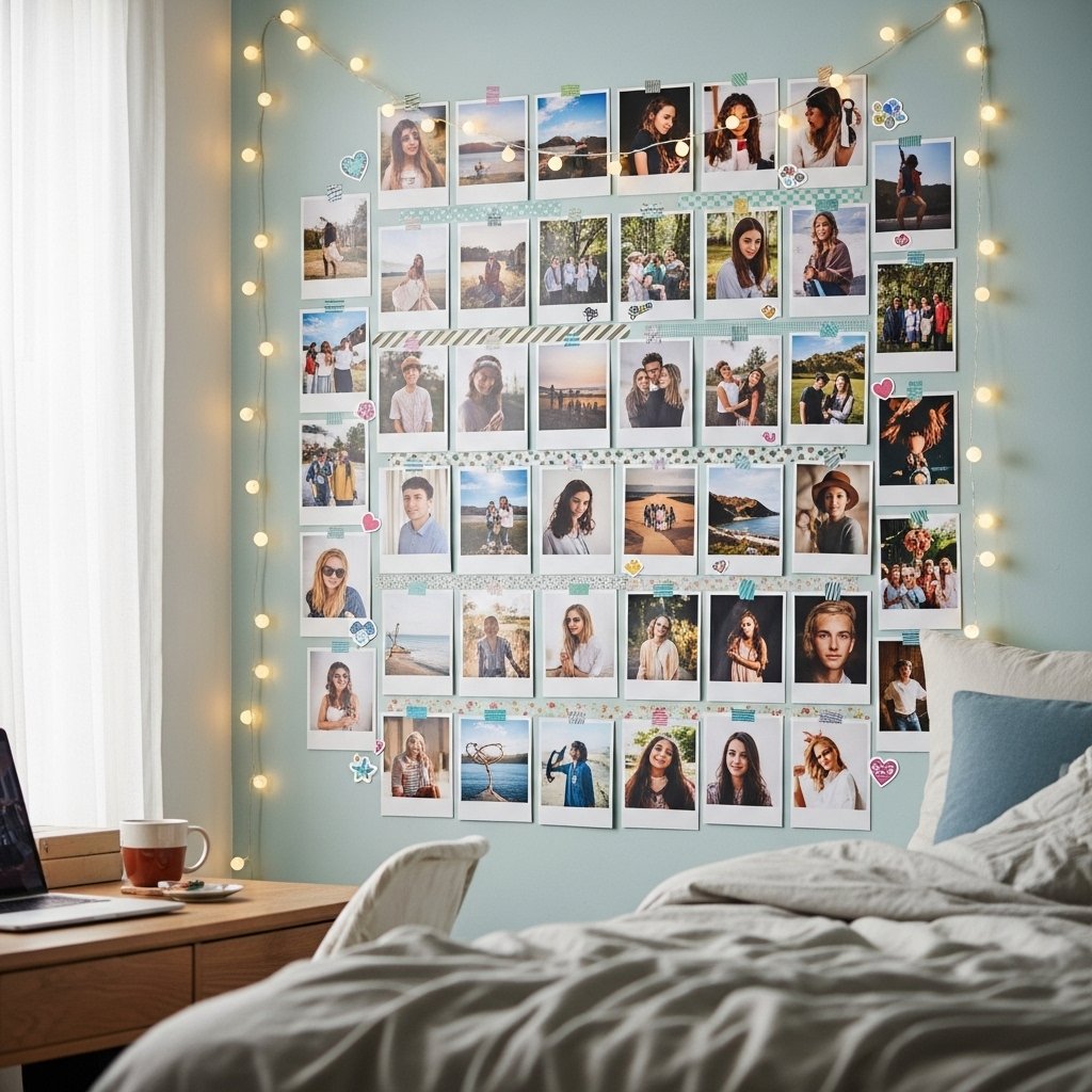 A photo collage wall is a perfect DIY bedroom decor idea that makes your room more personal. Print your favorite photos and arrange them on the wall in a grid or random pattern. You can add fairy lights, stickers, or washi tape to enhance the look. This decor idea is great for creating memories and making your room feel cozy. It’s easy to change anytime, making it perfect for seasonal updates.