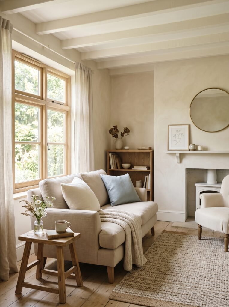 A key feature of the cottage aesthetic interior is the use of soft, neutral colors. Shades like cream, beige, warm white, and soft gray create a calm and airy environment. These tones help reflect natural light, making spaces feel larger and more open. You can also add subtle pastel accents like blush pink or sage green for a gentle touch of color. This foundation sets the perfect tone for a cozy and timeless cottage-style home.