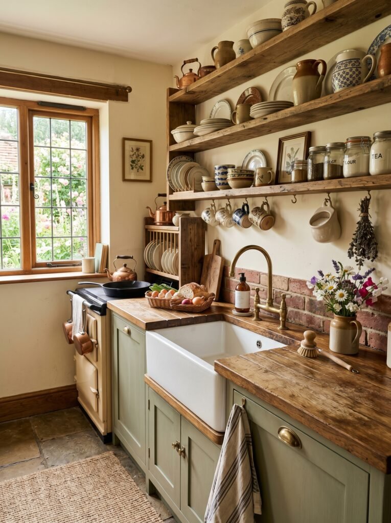 The kitchen in a cottage aesthetic home is both functional and charming. Open shelves, ceramic dishes, and wooden countertops are commonly used. Farmhouse sinks and vintage-style fixtures enhance the rustic appeal. Displaying everyday items like jars, mugs, and utensils adds character. This approach makes the kitchen feel warm and welcoming rather than purely utilitarian.