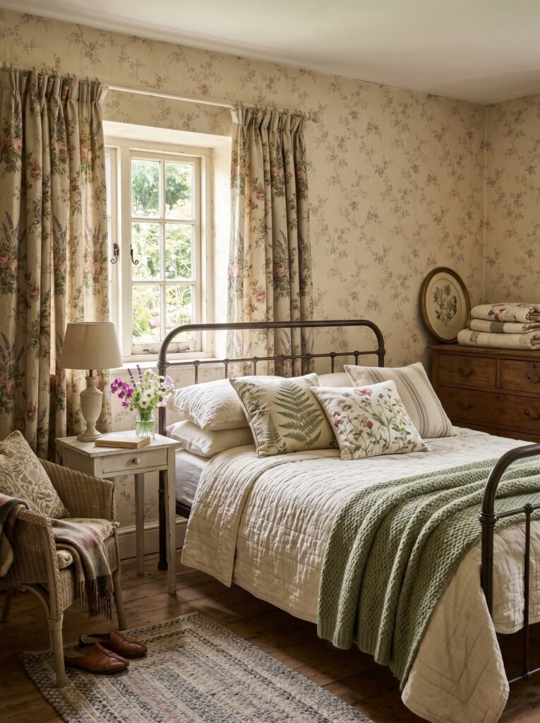 Floral patterns are a signature element of the cottage aesthetic interior. They can be used in curtains, cushions, wallpapers, or bedding to add a soft, romantic touch. Small floral prints in muted tones work best to avoid overwhelming the space. Botanical designs also bring a sense of freshness and connection to nature indoors. This detail enhances the cozy and nostalgic atmosphere of the cottage style.