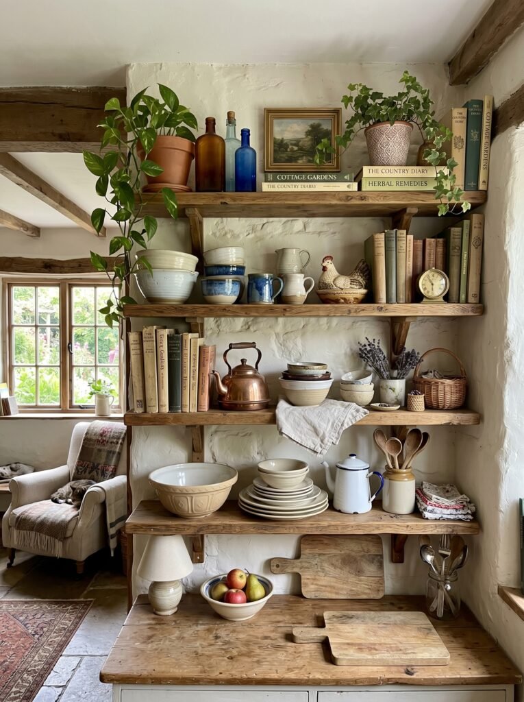 Open shelving is both practical and decorative in cottage interiors. Wooden shelves can be used to display ceramics, books, plants, and vintage items. This creates a lived-in and personalized look while keeping essentials accessible. Arranging items in an organized yet relaxed way enhances the aesthetic appeal. It also allows you to frequently update decor based on seasons or moods.