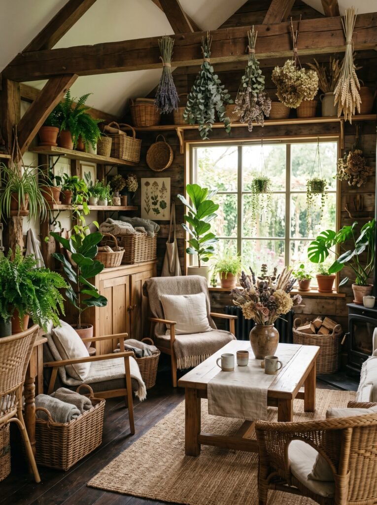 Bringing nature indoors is a core principle of the cottage aesthetic interior. Indoor plants, dried flowers, and fresh greenery add life and freshness to the space. Simple potted plants like ferns or ivy work especially well in this style. You can also use wooden, stone, or wicker materials to enhance the natural feel. These elements help create a calming and organic environment.