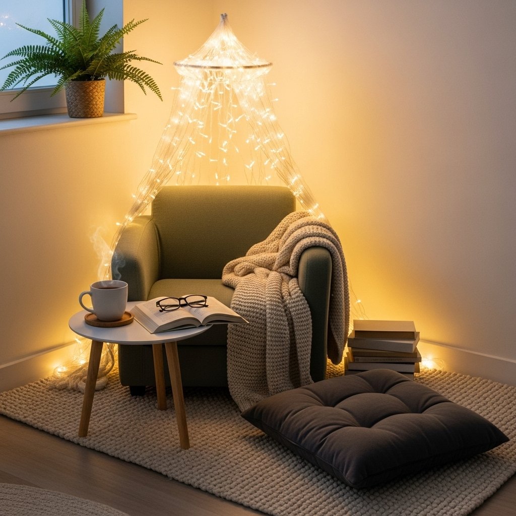 Even in a small bedroom, a tiny reading corner creates a cozy retreat for couples or individuals. A compact chair, floor cushion, or small bench paired with a soft throw and fairy lights above makes a perfect nook. Include a small side table for books or tea. This cozy space encourages relaxation while adding a cottage-inspired, magical feel. Fairy lights make the nook inviting, especially during evenings.