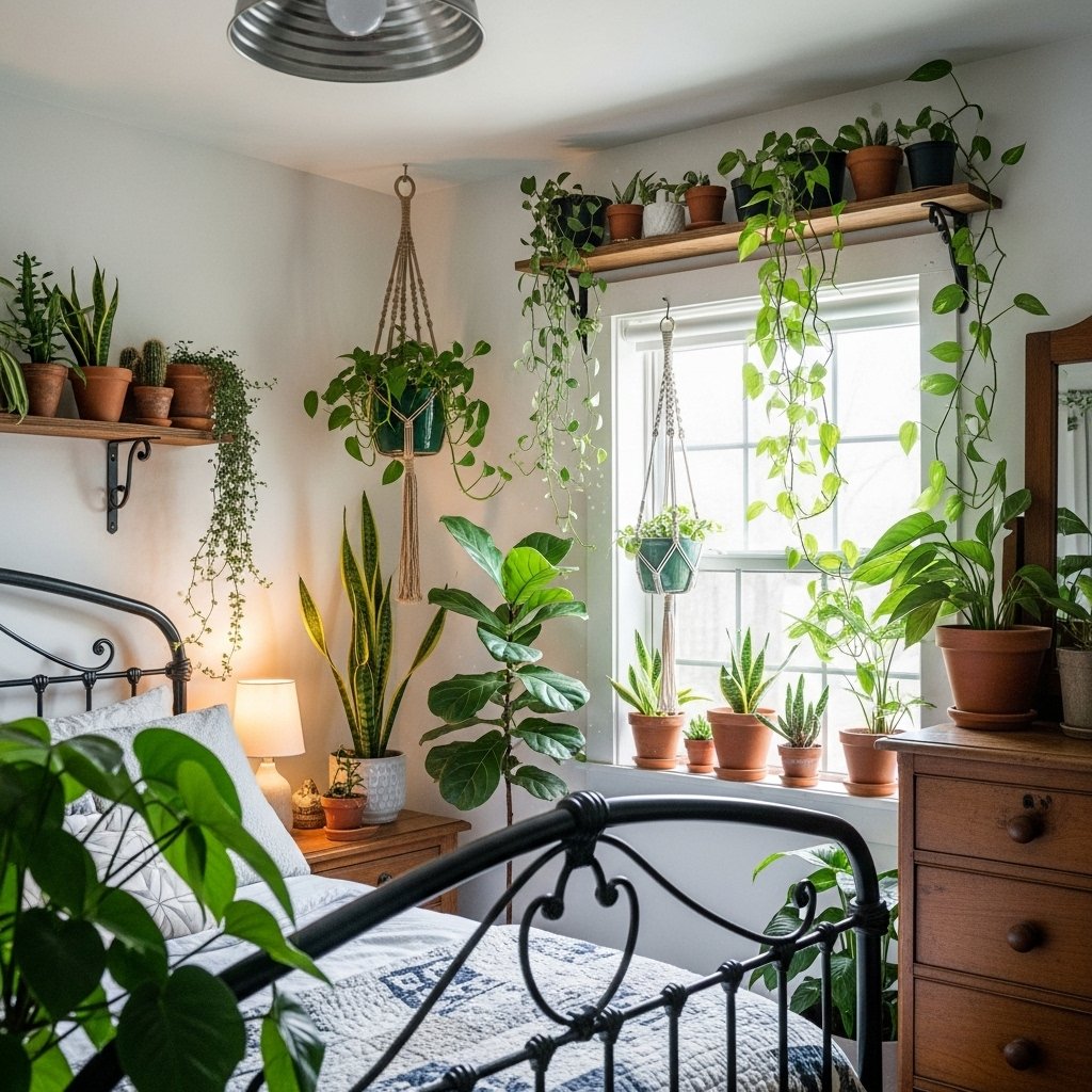 Indoor plants bring life and color to a small cottage bedroom. Small potted plants on shelves, hanging planters near the window, or a trailing vine can make the space feel fresh and lively. Greenery pairs beautifully with fairy lights to create a whimsical, natural environment. Plants also improve air quality and contribute to a calm and relaxing atmosphere. Even in small bedrooms, a few well-placed plants can transform the room’s mood.