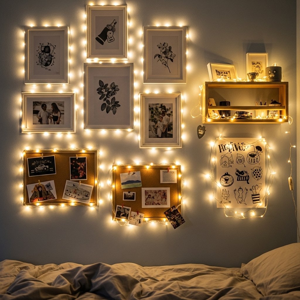Creating wall art displays using fairy lights is perfect for a magical cottage look. Frame photos, quotes, or small prints with string lights or hang them in a loose arrangement on the wall. The soft glow adds warmth while highlighting personal touches. Minimal frames in white, wood, or pastel colors complement the cozy aesthetic. This idea allows you to combine personality, style, and lighting in one simple décor element.