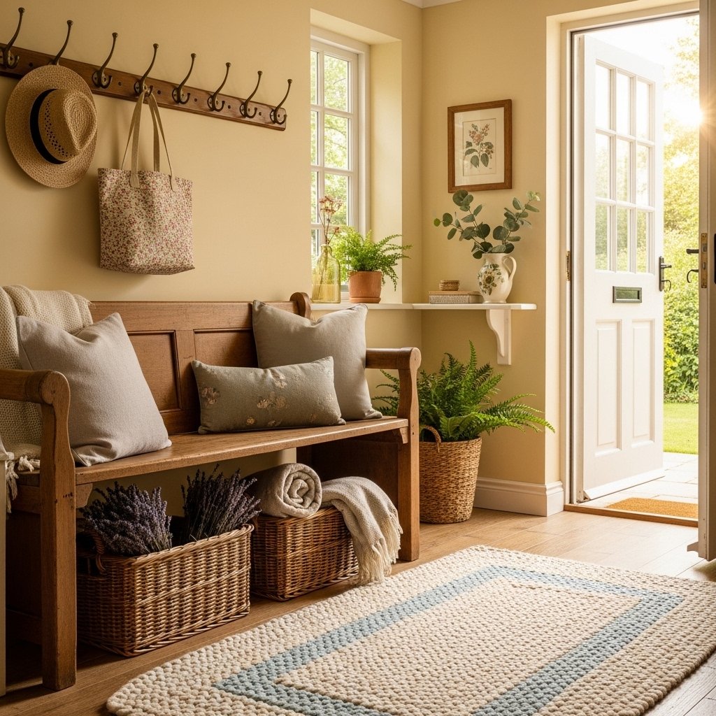 The entryway sets the tone for a cottage style home interior. Wooden benches, vintage hooks, and woven baskets create a practical yet charming space. Soft rugs and floral accents make the area feel welcoming. A small console table with décor items adds personality. This design ensures guests feel the warmth of the home from the moment they enter.