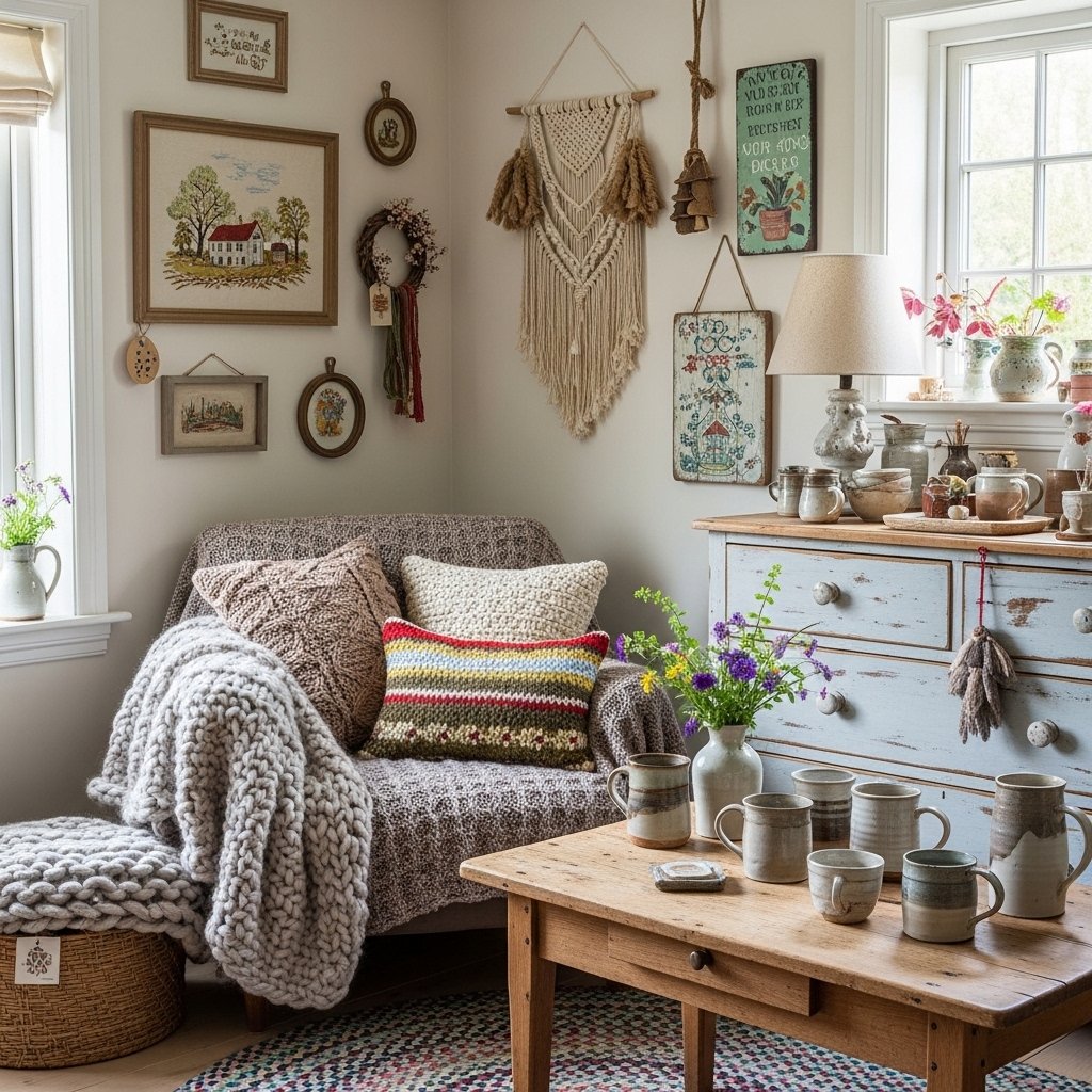 Handmade décor is an important part of cottage style interiors. DIY wall art, knitted cushions, and painted furniture add a personal touch. These handmade items bring uniqueness and emotional value to the home. Repurposing old furniture also fits perfectly with the cottage aesthetic. This approach creates a cozy, lived-in, and meaningful environment.