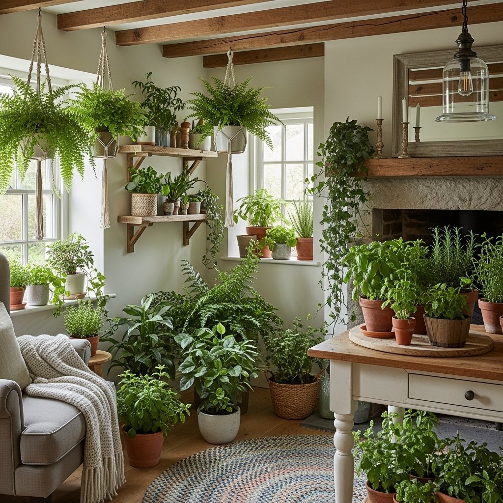 Indoor plants are essential for completing the cottage style look. Greenery such as ferns, ivy, and small potted herbs brings freshness and life into the home. Plants soften interior spaces and connect the indoors with nature. Wooden or ceramic pots enhance the rustic charm. This natural element makes the home feel calm, balanced, and refreshing.