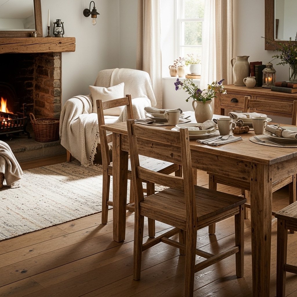 Rustic wooden furniture is a key feature of cottage style homes interior design. Natural wood textures add warmth, character, and a sense of authenticity to any space. Weathered finishes, distressed tables, and handcrafted chairs work especially well in living rooms and dining areas. These pieces often look slightly imperfect, which enhances the cozy cottage charm. Mixing different wood tones creates depth while keeping the space grounded and natural.