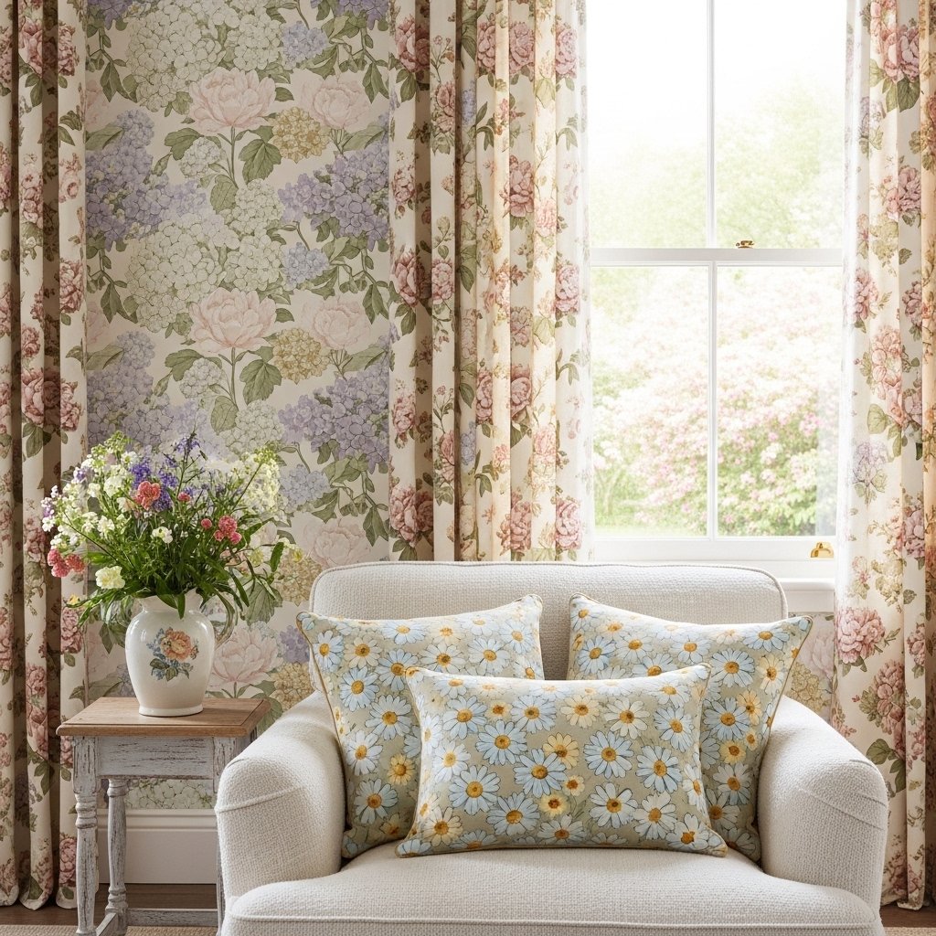 Floral patterns are a signature element of cottage style interiors. They can appear on curtains, cushions, wallpapers, or bedding to add softness and femininity. Small floral prints create a vintage-inspired look without overwhelming the space. These patterns work beautifully when paired with neutral backgrounds and wooden furniture. Floral accents help bring nature indoors and enhance the cozy atmosphere.