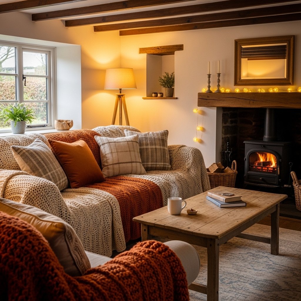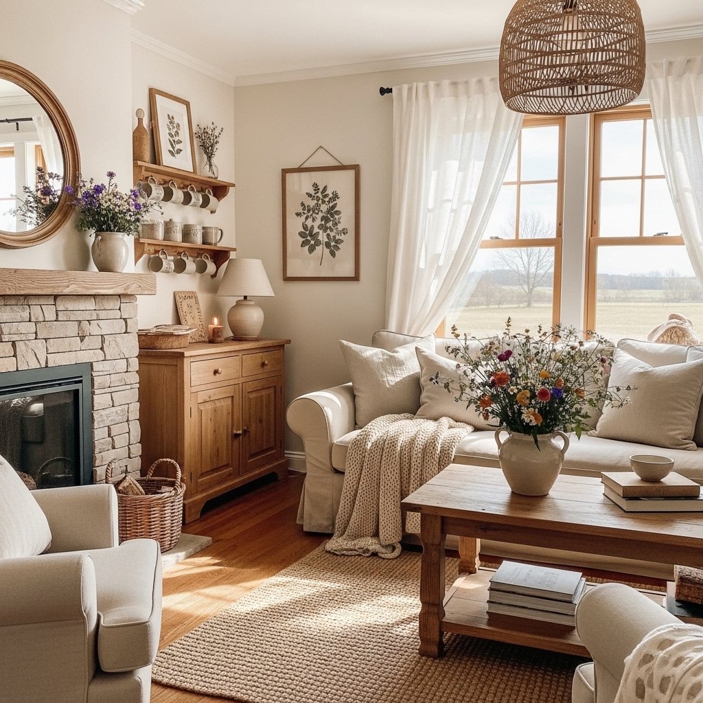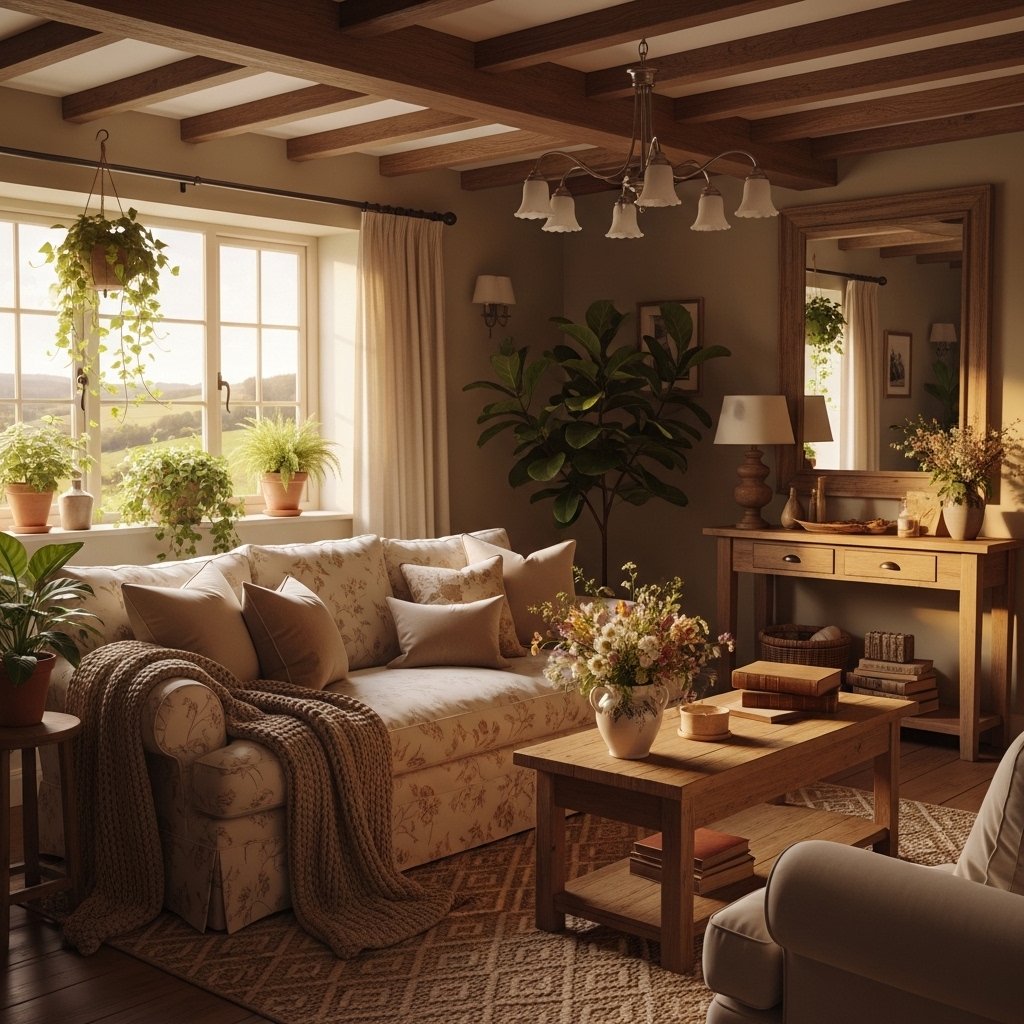 A cottage style living room focuses on comfort, layering, and relaxation. Soft sofas with oversized cushions and knitted throws create a welcoming seating area. A coffee table made of reclaimed wood adds rustic charm to the space. Adding warm lighting through lamps or candles enhances the cozy feel. This setup is perfect for family gatherings, reading, or relaxing evenings.