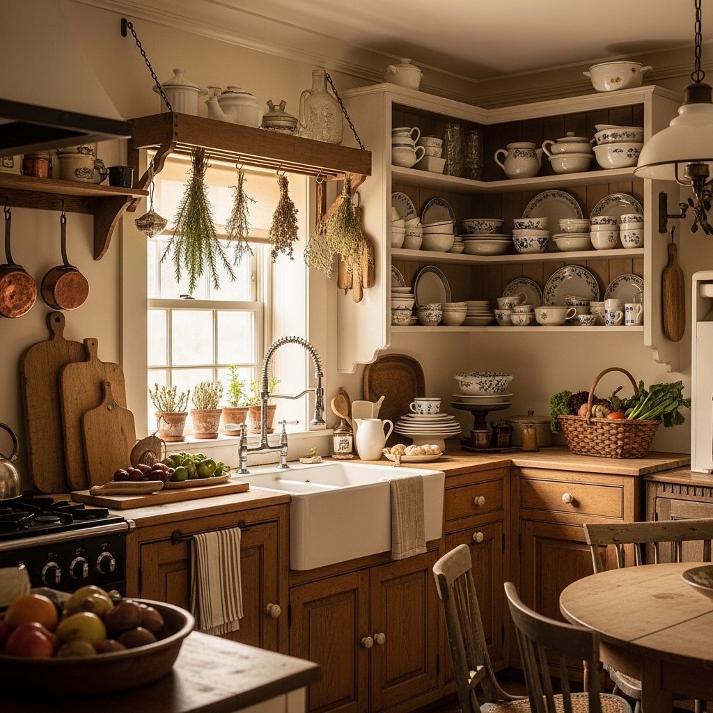 A cottage style kitchen blends functionality with nostalgic charm. Open shelving, ceramic dishes, and farmhouse sinks are commonly used elements. Wooden cabinets with soft paint finishes create a warm and homely atmosphere. Hanging herbs, copper utensils, and vintage jars add decorative detail. This kitchen style feels practical yet full of personality and history.