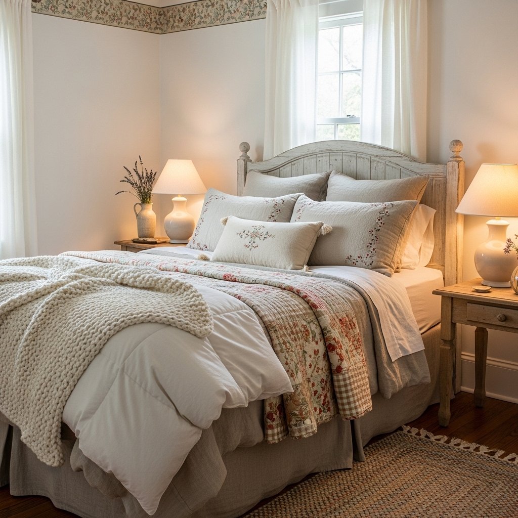 A cottage bedroom is designed to feel like a peaceful retreat filled with softness and comfort. Layered bedding with quilts, linen sheets, and plush pillows creates a welcoming bed space. Soft lighting from bedside lamps enhances relaxation and warmth. Wooden headboards or antique-style frames add character to the room. This design promotes restful sleep and a calming environment.