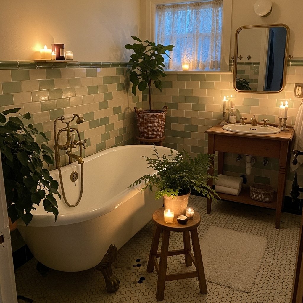 A cottage style bathroom combines simplicity with vintage charm. Clawfoot tubs, ceramic tiles, and brass fixtures are popular design choices. Soft pastel walls or white tiles keep the space clean and airy. Wooden storage shelves add warmth and practicality. Small decorative touches like candles or plants complete the relaxing spa-like feel.