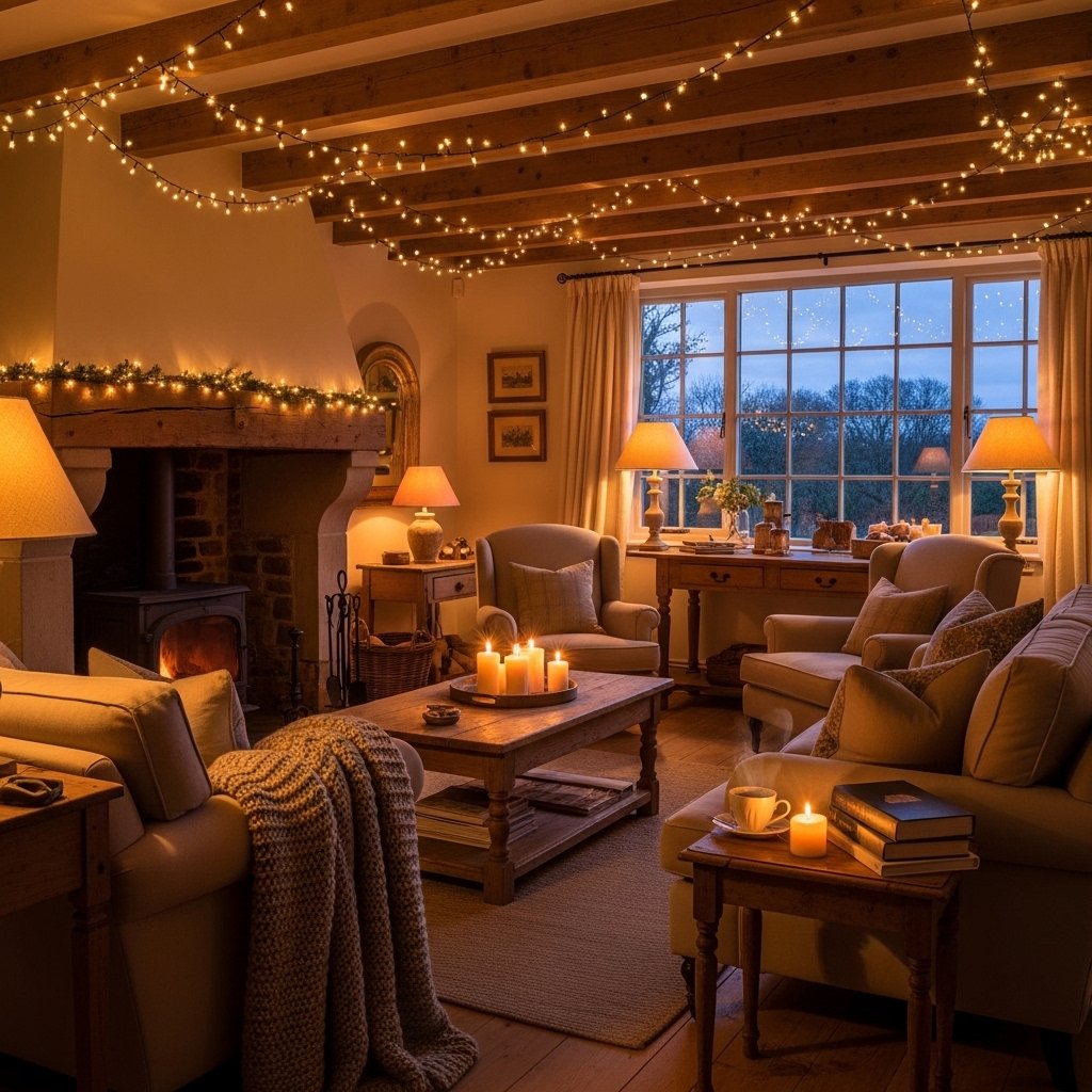 Lighting plays a major role in cottage style interiors. Warm-toned bulbs, fairy lights, and table lamps create a soft glow throughout the home. Natural light is also emphasized with sheer curtains that allow sunlight to filter in gently. Soft lighting enhances the cozy and peaceful atmosphere. This helps create a welcoming home environment, especially during evenings.