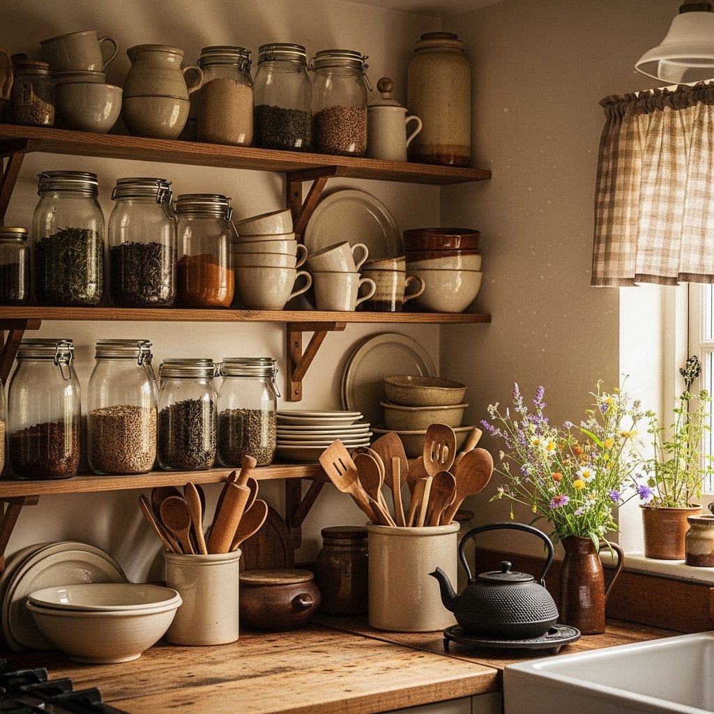 A cottagecore kitchen focuses on simplicity and functionality with a rustic touch. Open shelves, ceramic dishes, and wooden utensils add charm and practicality. Display everyday items like jars, teapots, and cookware for a lived-in look. Natural materials like wood and stone enhance the overall aesthetic. This approach makes your kitchen feel warm, inviting, and nostalgic.