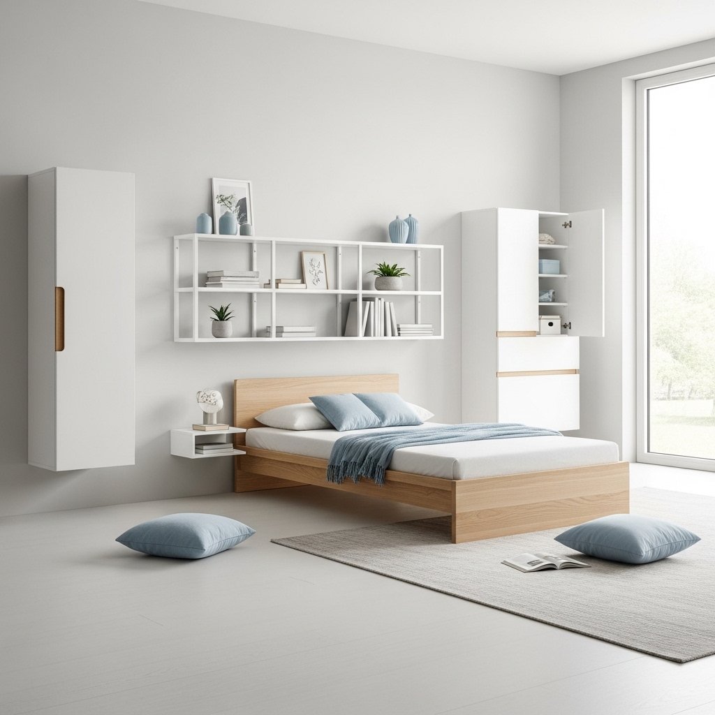For a small baby blue bedroom, compact furniture like a single bed, floating shelves, and a small bedside table works best. Multifunctional furniture, such as a storage ottoman or a bed with drawers, helps save space. Choosing light-colored furniture complements the baby blue theme and keeps the room airy.
