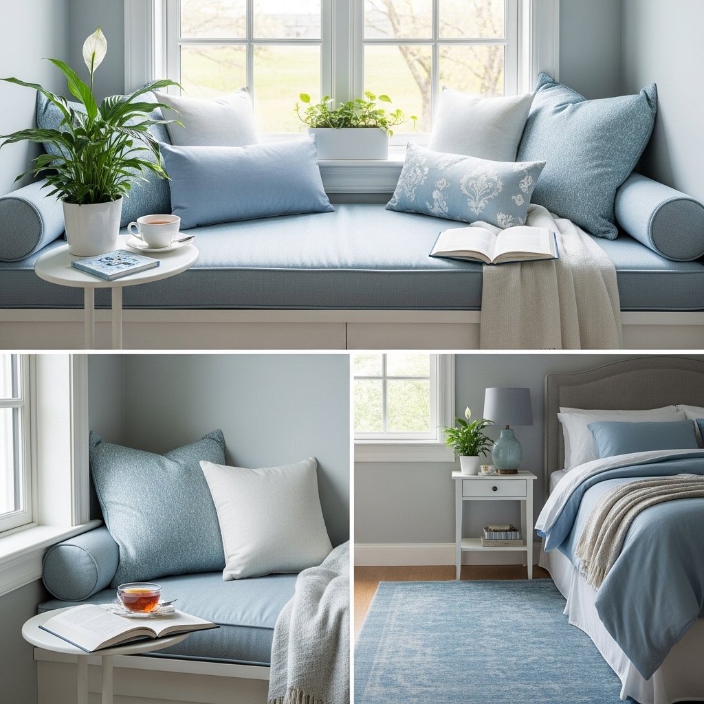Even in a small bedroom, a dedicated baby blue reading nook can create a serene escape. Use a compact armchair, floor cushions, or a small bench with soft blue throws and pillows. Add a small bookshelf or wall-mounted shelves to keep favorite books within reach. A reading nook encourages relaxation while complementing the calming color scheme. Including subtle lighting, like a soft lamp or fairy lights, enhances the cozy vibe.