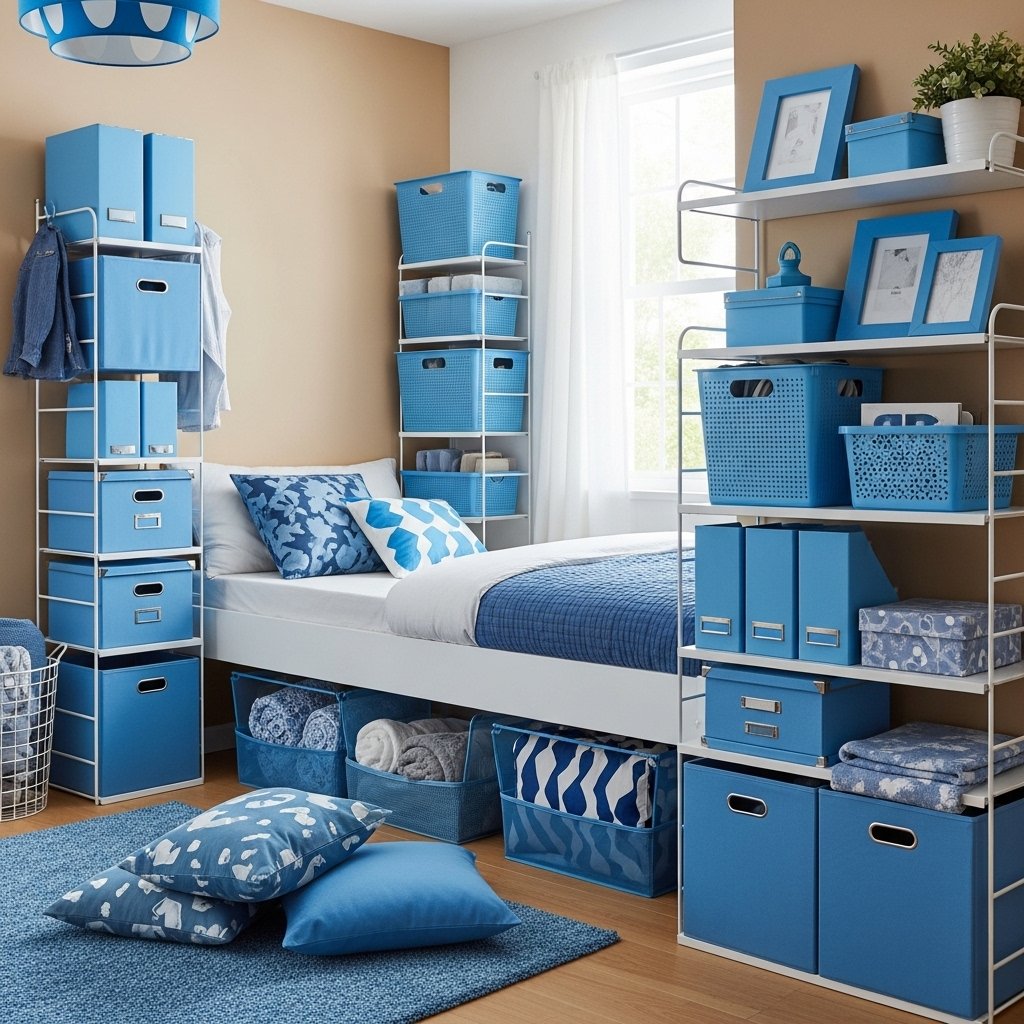 Smart storage is essential for small bedrooms, and adding blue accents makes it stylish too. Use blue storage bins, baskets, or under-bed organizers to keep clutter under control while coordinating with the room’s color palette. Vertical shelving painted or accented in blue maximizes space without crowding the room. Organized spaces not only look tidy but also contribute to a calming, cozy atmosphere. Functional décor ensures comfort and practicality in a small bedroom.
