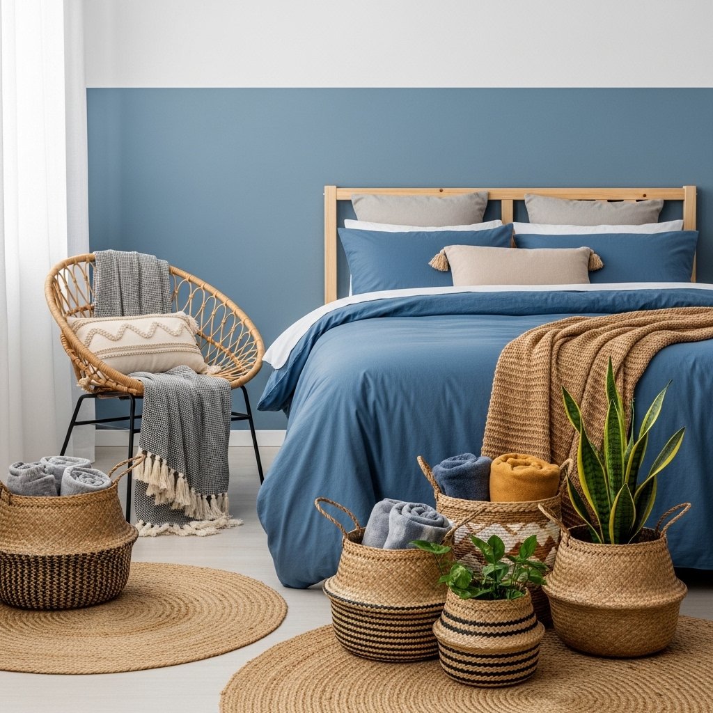 Blending blue with natural materials like wood, rattan, or jute creates a warm and inviting contrast. Wooden bed frames, rattan chairs, or woven baskets complement blue walls and textiles beautifully. Adding indoor plants with green foliage enhances freshness and liveliness while keeping the cozy vibe intact. This combination of blue and natural textures adds dimension and depth to small spaces. Nature-inspired elements make the bedroom feel peaceful, balanced, and homey.