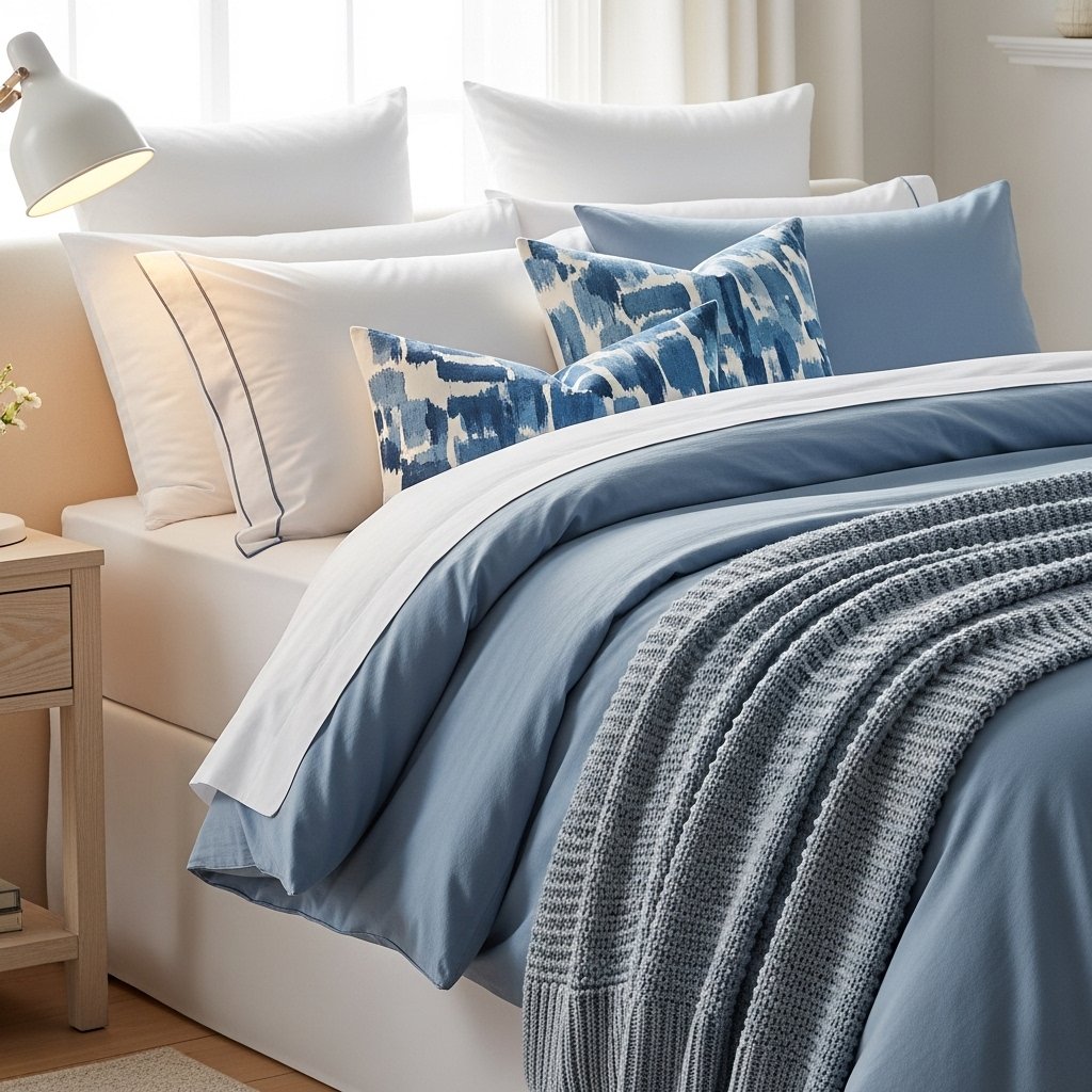 Using blue and white bedding is a classic way to balance color without overwhelming a small space. White sheets with soft blue duvet covers or patterned pillows add depth while keeping the room feeling fresh. Layering textures like cotton, linen, and knit blankets increases the cozy factor. Consider adding a plush blue throw at the end of the bed for warmth and style. This combination works well for both minimalist and eclectic bedroom designs.