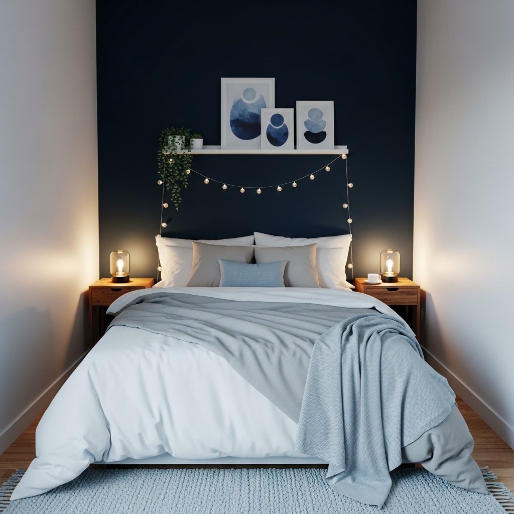 Creating a navy blue accent wall behind your bed adds sophistication and a sense of intimacy. Darker blue shades make the room feel grounded while still complementing lighter walls or furniture. You can enhance the effect with soft lighting, such as bedside lamps or string lights, to maintain a cozy ambiance. Pairing the navy wall with neutral bedding or subtle blue décor balances depth without overpowering the small space. It’s an easy way to make a statement while keeping the room inviting.