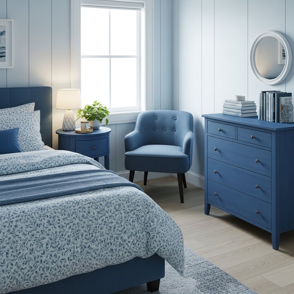 Adding blue accents through furniture pieces is a smart way to introduce color without overwhelming the room. Consider a blue nightstand, dresser, or upholstered chair to anchor the space. Smaller furniture in darker or muted blue shades works especially well in small bedrooms where space is limited. This approach allows you to blend functionality and design seamlessly. Accent furniture also makes it easy to swap or update color elements as your style evolves.