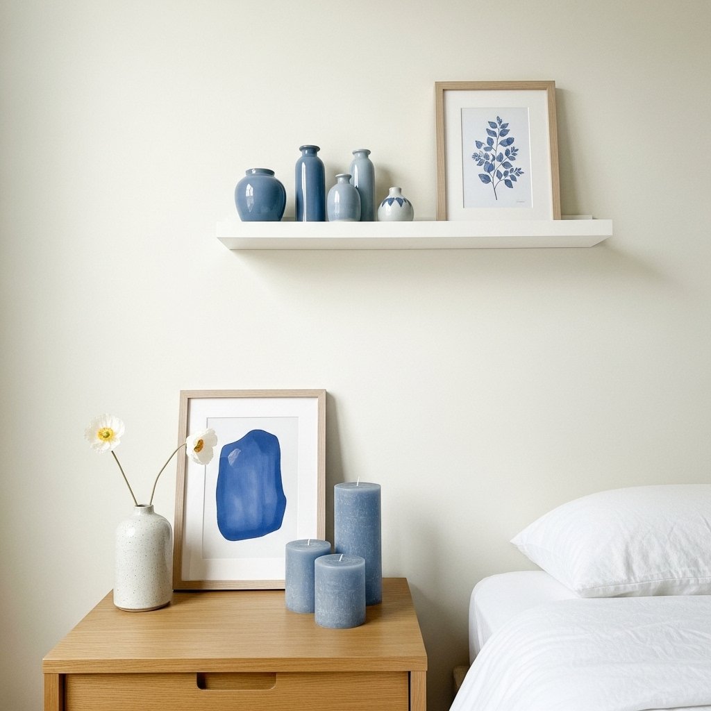 For small rooms, less is more. Incorporating minimalist blue décor, such as small framed prints, vases, or candle holders, adds charm without clutter. Choose décor items in soft or muted blue shades to keep the space balanced and soothing. Strategically placing these pieces on shelves or nightstands can create focal points that elevate the room’s style. Minimalist blue accents make the bedroom feel airy, clean, and cozy at the same time.